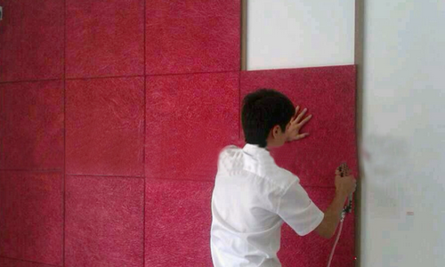 用力邦或多樂士、典彩乳膠漆加適量的水用噴槍將涂料直接噴在板材上,一般連續(xù)來回兩 三遍即可。保持所有地方都能夠均勻上色且不要噴的太厚以免影響吸聲效果。